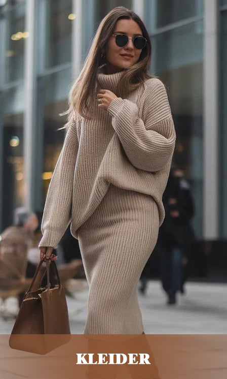 Lässiges, einfarbiges pullover-netzkleid-set mit hohem kragen