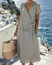 SPEZIFIKATIONEN Stil: Zwanglos Material: Baumwollmischungen Kleid Typ: Gerades Kleid Kleid Länge: Midi Ausschnitt: V-Ausschnitt Muster Typ: Einfarbig Ärmel Typ: Regulärer Ärmel Ärmellänge: Kurze Ärmel Einzelheiten: Geschnürt Passform Typ: Normal Jahreszeit: Frühling,Sommer Anlass: Täglich Paket enthält: 1 x Kleid GRÖSSENTABELLE (cm) Grö...