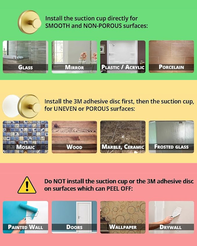 Saugnapfhaken eignen sich für glatte und nicht poröse Oberflächen wie Glas, Spiegel, Marmor, Keramik, Edelstahl, Holz, Acryl, Kunststoffe und Laminat.
