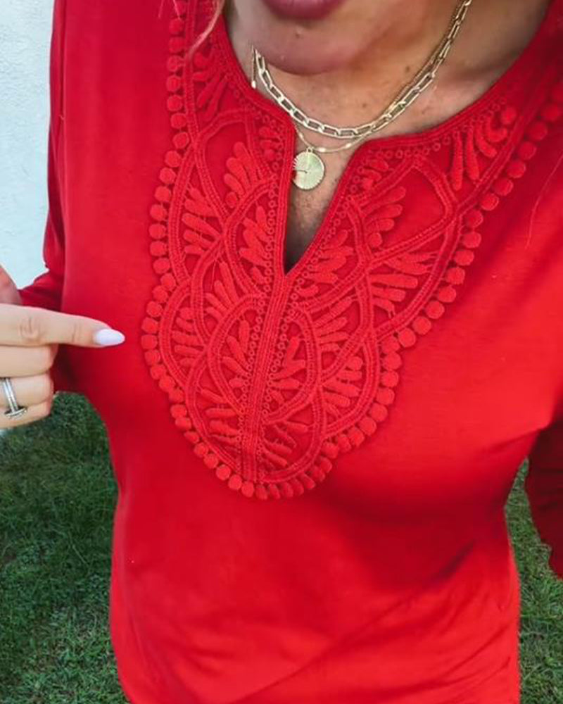 Bluse Uni-Farbe Revers Spitze Patchwork