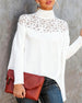 Bluse Uni-Farbe Revers Spitze Patchwork