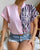 Bedruckte Bluse mit V-Ausschnitt und kurzen Spitzenärmeln