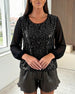 Bluse gerüscht Pailletten Patchwork stylisch