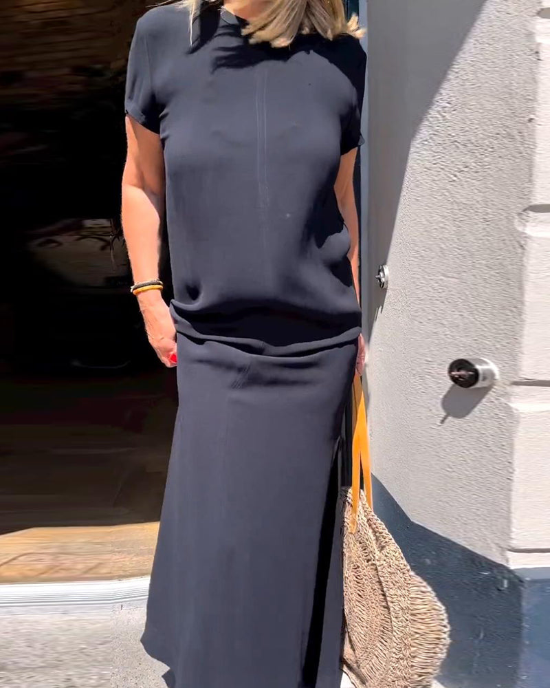 Elegantes einfarbiges kleid mit rundhalsausschnitt und tasche