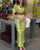 Langes kleid mit kurzen ärmeln und v-ausschnitt und kontrastierendem print