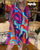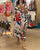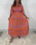 Bunt bedrucktes, kurzärmeliges, langes Schnürkleid
