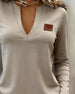 Top Kontrastfarbe Klappe V-Ausschnitt Langärmlig