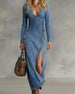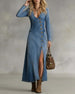 Kleid tiefer V-Ausschnitt Knopfleiste Schlitz Denim Maxi