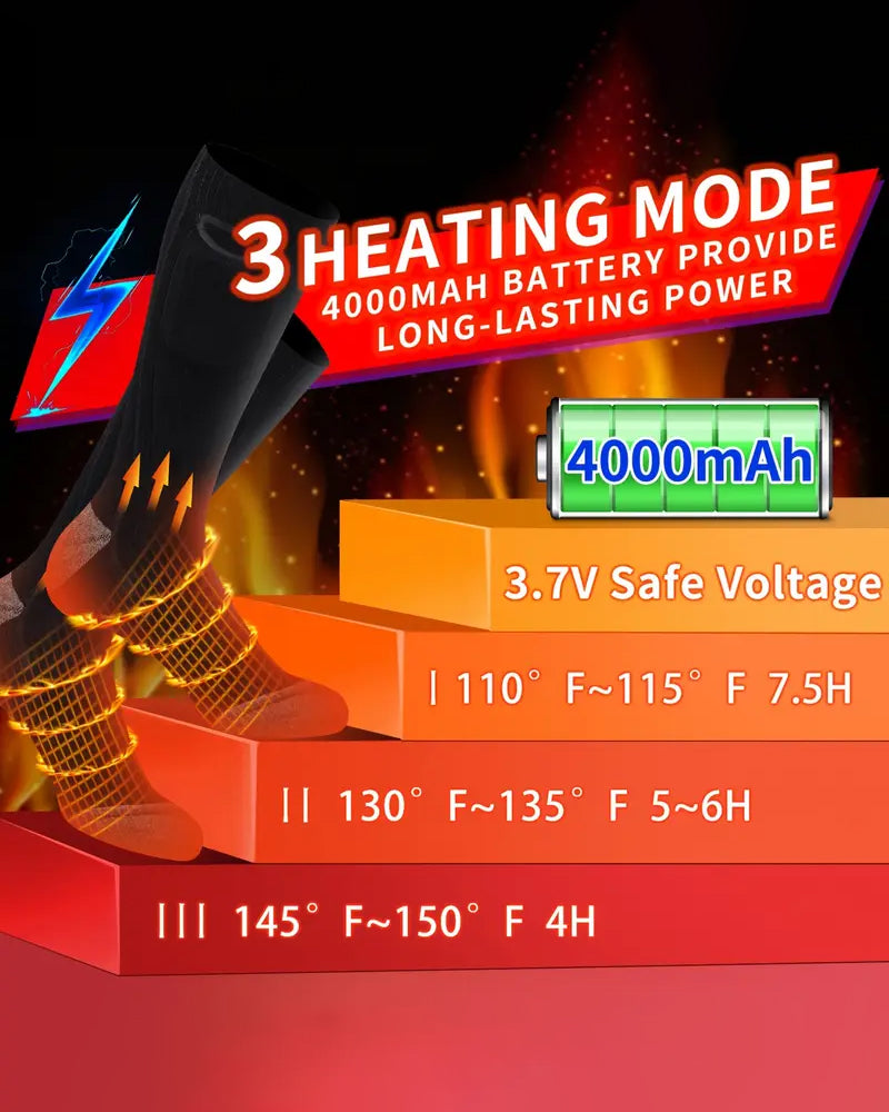 Diese Heizsocken Für Männer Und Frauen sorgen dafür, dass Ihre Füße lange warm und gemütlich bleiben. Erleben Sie Outdoor-Aktivitäten auch bei strengen Winterbedingungen! Leiden Sie nachts immer noch unter kalten Füßen aufgrund unzureichender Durchblutung? Machen Sie sich Sorgen um Erfrierungen an den Füßen beim Wintersport wie Skifahren, Jagen, Wandern oder Camping? Diese Heizsocken sind die ideale Lösung – sie bieten verbesserten Komfort, fortschrittliche Technologie und Bequemlichkeit.