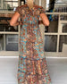 Langes, bedrucktes Kleid mit V-Ausschnitt und kurzen Ärmeln