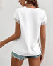 SPEZIFIKATIONEN Oberteil Typ: T-shirt Stil: Zwanglos Material: Baumwollmischungen Anlass: Täglich Ausschnitt: V-Ausschnitt Muster Typ: Einfarbig Ärmel Typ: Regulärer Ärmel Ärmellänge: Kurze Ärmel Passform Typ: Normal Jahreszeit: Frühling,Sommer,Herbst Einzelheiten: Patchwork,Knöpfe,Spitze Paket enthält: 1 x T-shirt GRÖSSENTABELLE (cm) Größe ...